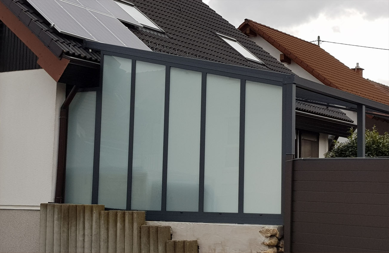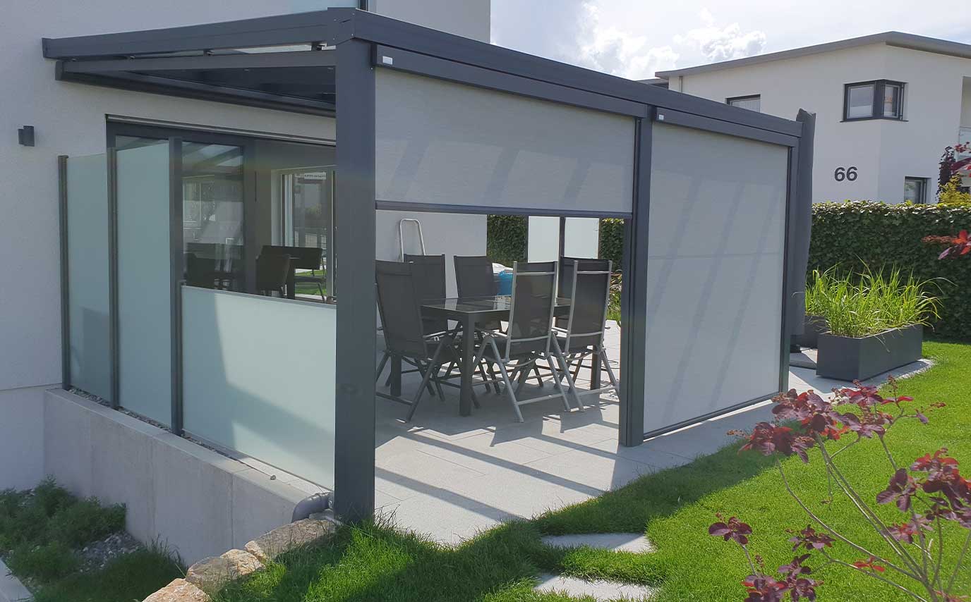 Ergänzen Sie Ihr Dach mit Seitenelementen aus Festverglasung oder Schiebeelementen und schaffen Sie einen geschlossenen Raum, der vor Wind schützt und Licht hereinlässt.