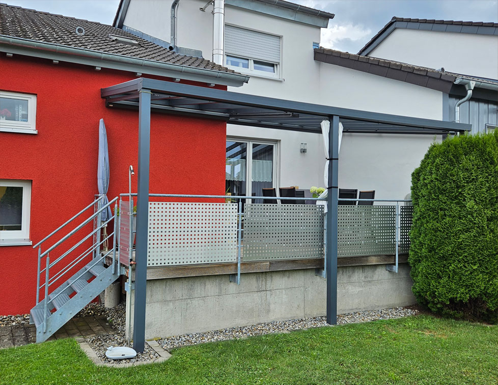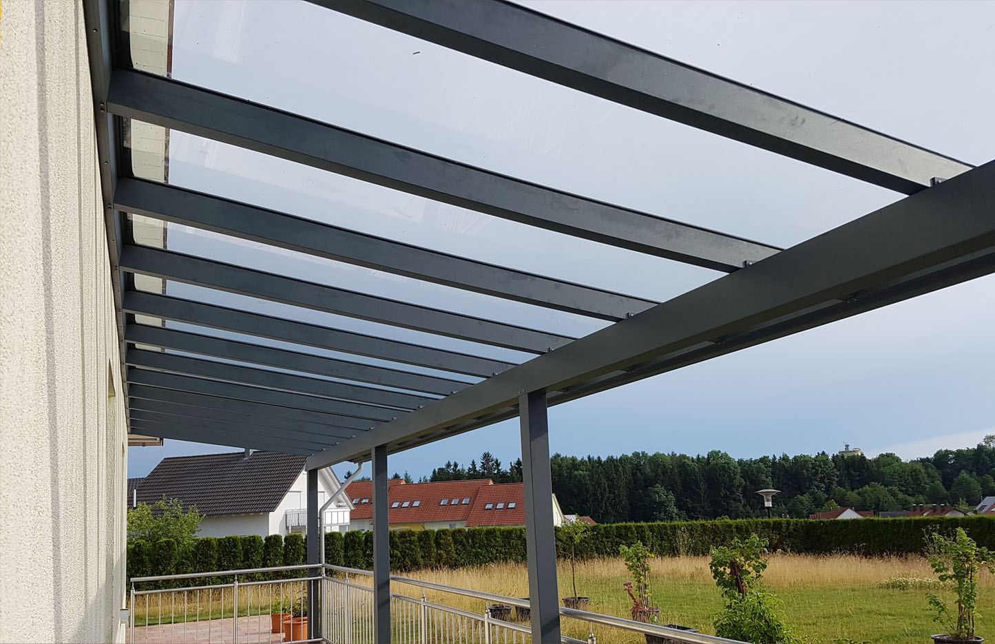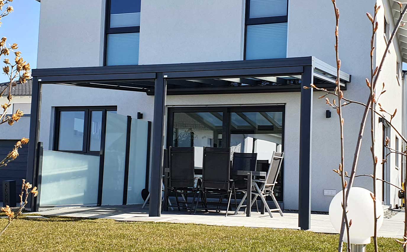 Wir planen, fertigen und montieren Ihr Terrassendach individuell – wahlweise mit Verbundsicherheitsglas (VSG) oder hochwertigen Stegplatten als Dacheindeckung.